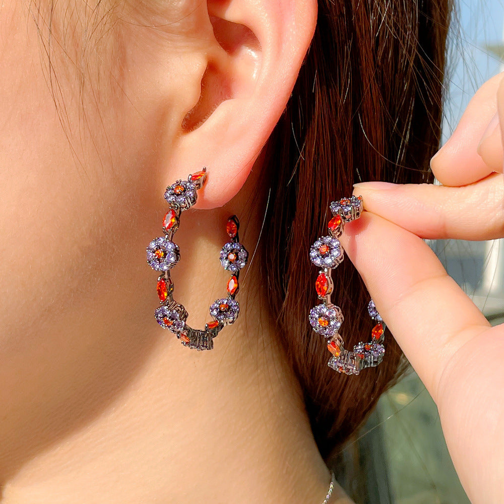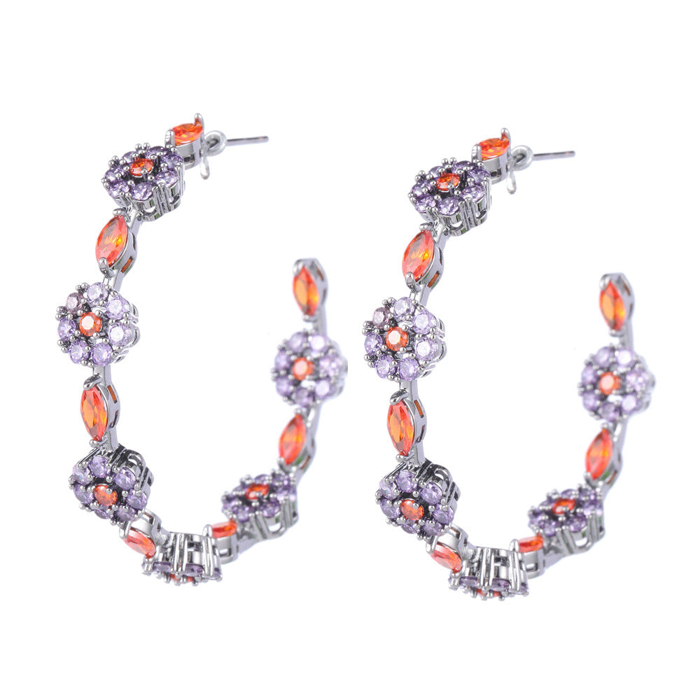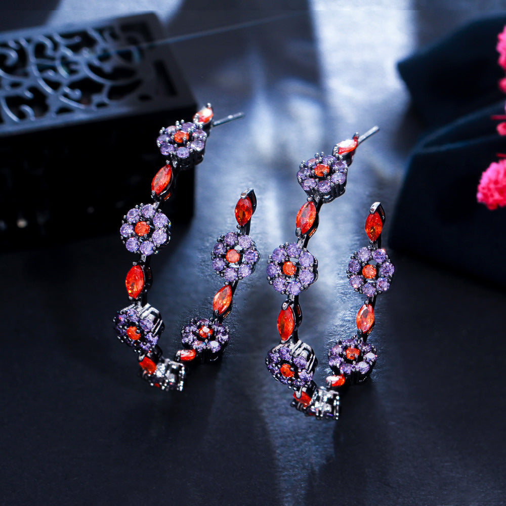 Silver Needle Gun Black Zircon Color Flower Hoop Earrings